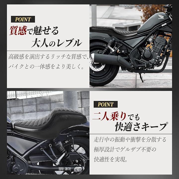 職人による精密カットで美しい縫い目を実現しプレミアムPUレザーが醸し出す上質な質感でバイクのスタイリングを一段上のレベルへ押し上げる大人のレブルにふさわしい逸品です。