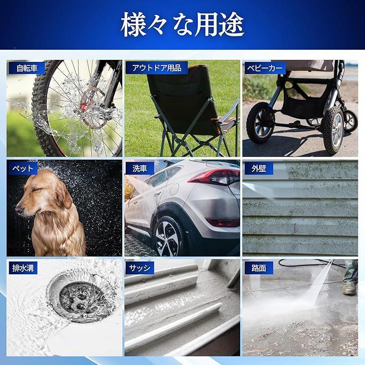 「多用途に対応」窓やベランダ、排水溝など家庭用から頑固なアウトドア用まで幅広く対応可能。自転車、車、庭の家具、キャンプ用品など、あらゆるシーンで活躍するノズルです。