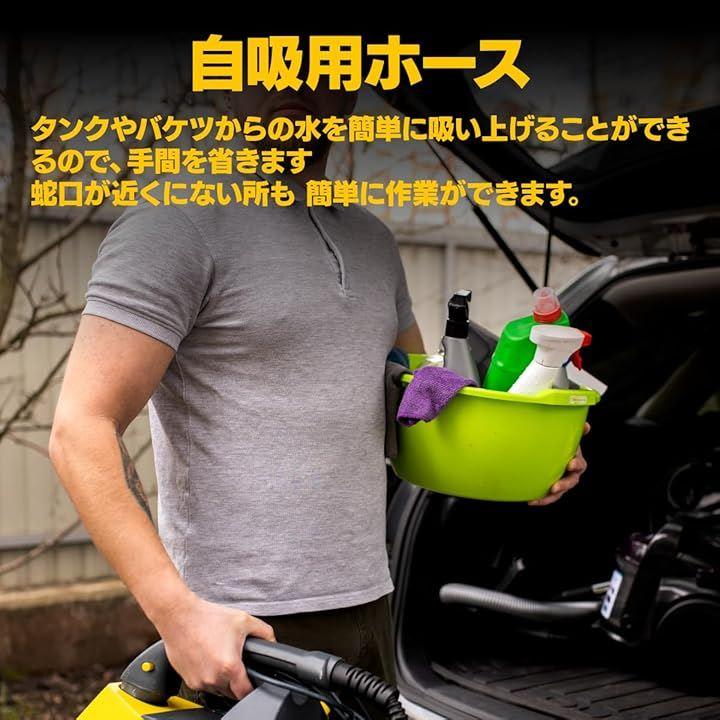 自吸用ホースが5mの長さを持ち、広範囲の洗浄が可能です。