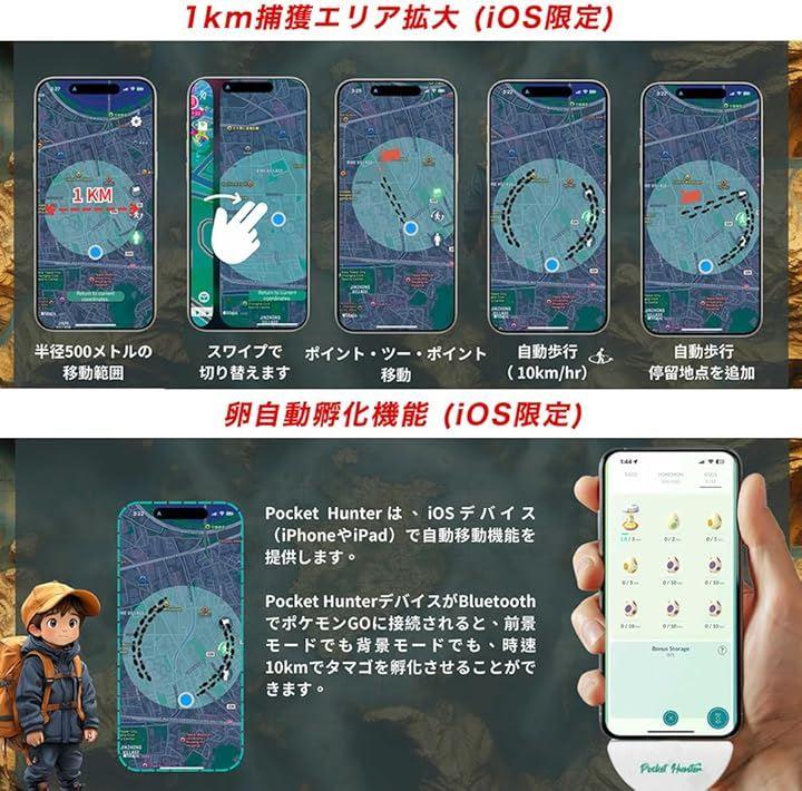 1km範囲内を時速10kmで自動移動することができ、自宅にいながら次々に自動捕獲できるだけでなく、歩かず効率的に距離を稼ぎポケストップで手に入れたタマゴも自動的に孵化可能です。