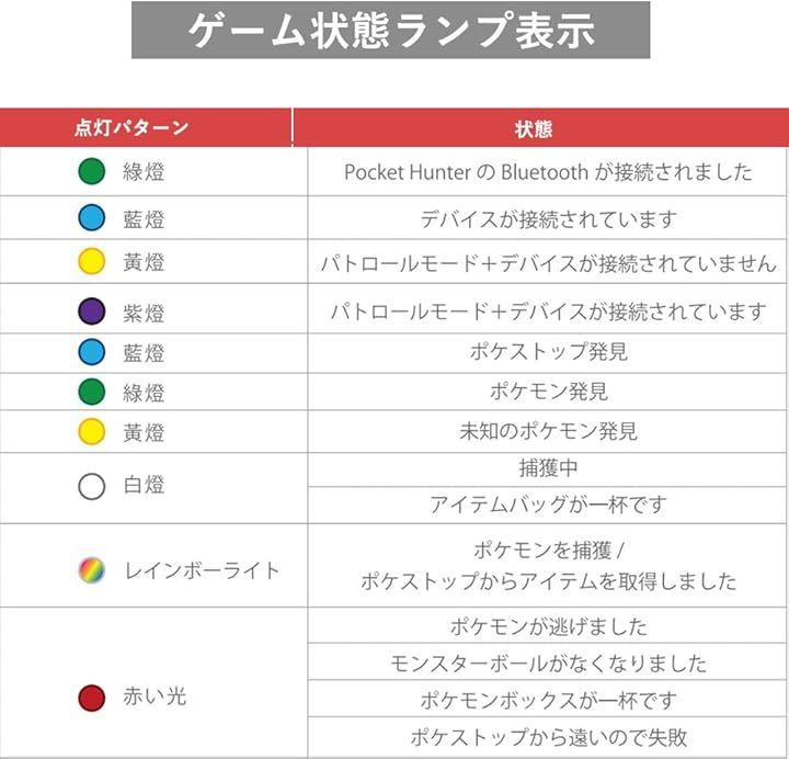 「わかりやすいLED表示でステータス確認。」捕獲時やポケストップ発見など、ゲームの重要なステータスをLEDランプの色と点滅でお知らせします。