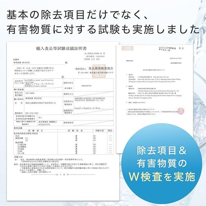 (遊離残留塩素、溶解性鉛、CAT、2-MIBカビ臭、ブロモホルム 、テトラクロロエチレン、トリクロロエチレン、フェノール類、ジェオスミン、ベンゼン、陰イオン界面活性剤、鉄(微粒子状) 、アルミニウム(中性)、PFOS/PFOA) ろ材の種類: 中空糸膜、イオン交換繊維、活性炭、不織布。