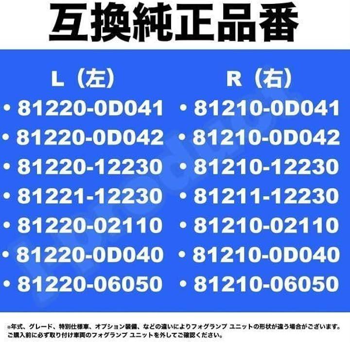 「互換純正品番」(L)・81220-0D041 ・81220-0D042 ・81220-12230 ・81221-12230 ・81220-02110 ・81220-0D040 ・81220-06050 (R)・81210-0D041 ・81210-0D042 ・81210-12230 ・81211-12230 ・81210-02110 ・81210-0D040 ・81210-06050 *年式、グレード、特別仕様車、オプション装備、などによりフォグランプ ユニットの形状が違う場合があります。
