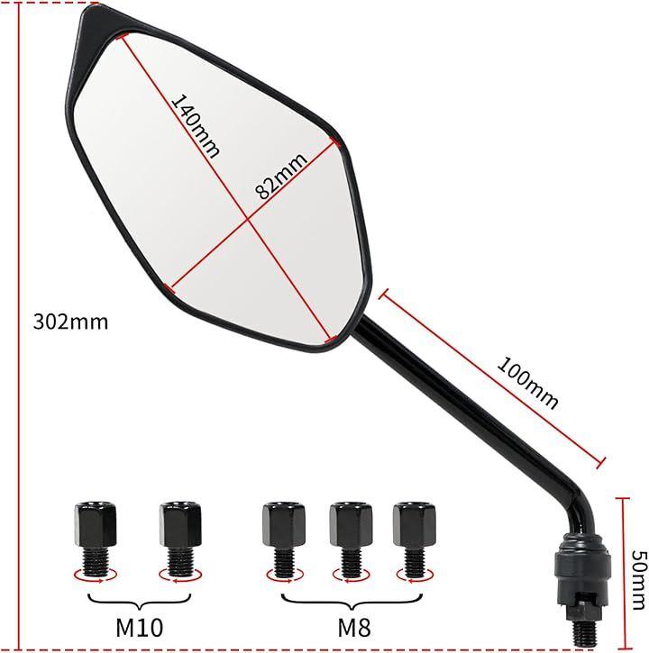 付属品:バイクミラー自体は10mm口径で、他の付属品も付属しており、M10正ネジx 1、M10逆ネジx 1、M8正ネジx 2、M8逆ネジx 1。