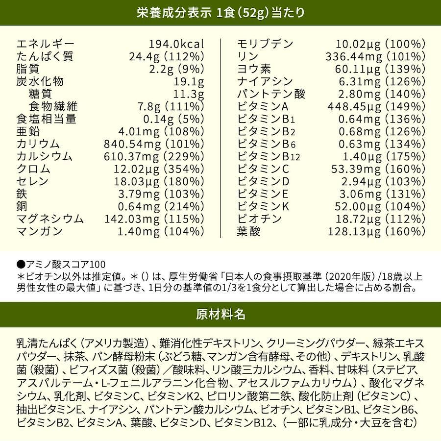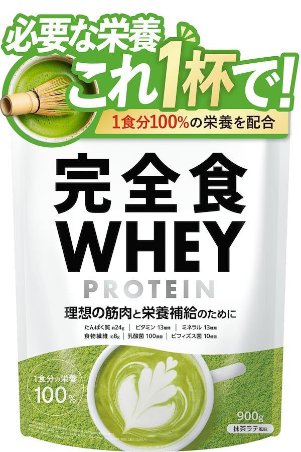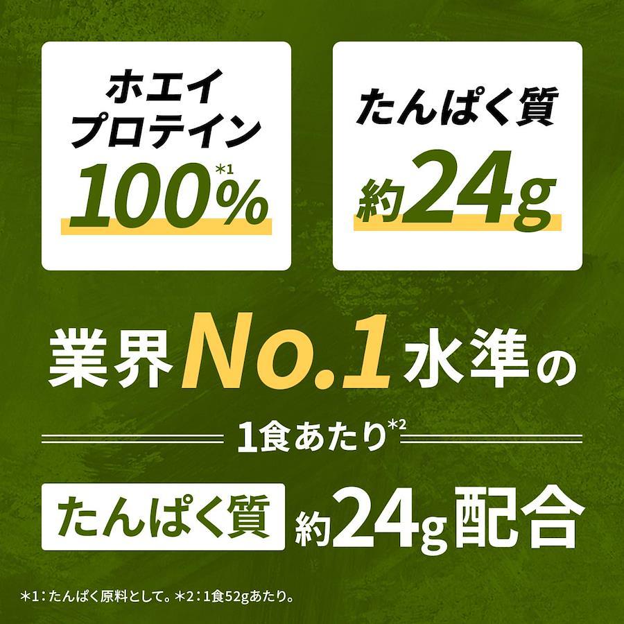 【完全栄養食ホエイプロテイン】1杯でたんぱく質約24gを配合。さらにビタミン&ミネラル26種、食物繊維などを加えて「完全栄養食のホエイプロテイン」を実現しました。【おいしい・溶けやすい・続けやすい価格】こだわり①美味しさ:飲みやすさ・美味しさにこだわり、水で美味しく飲める味わいを実現しました。こだわり②溶けやすさ:独自の処方で溶けやすさを追求。泡立ちやダマ感、こなっぽさを低減しました。こだわり③続けやすい価格:毎日飲むものだからこそ、栄養価と続けやすい価格にこだわりました。【飲みやすい抹茶ラテ風味】上品でまろやかな抹茶ラテの風味で、スッキリお飲みいただけます。【お召し上がり方】付属のスプーンすりきり3杯半(約52g)程度を200~250mlの冷たい水などに溶かしてお召し上がりください。【おすすめの摂取タイミング】トレーニング前後・忙しい朝食や昼食の変わりに・食事にプラスして栄養サポートに・1食おきかえダイエットなどにオススメです。【免責事項】メーカーによる商品リニューアルに伴いパッケージ(内容量も含む)変更が行われた場合、新パッケージでお届け致します事ご了承願います。