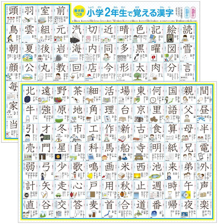 [Completely waterproof] Kanji chart for second graders Bath poster, second grade, A3 Yupo paper, 2 sheets, with stroke order, usage examples, and illustrations, waterproof
