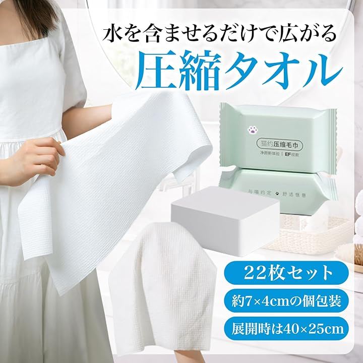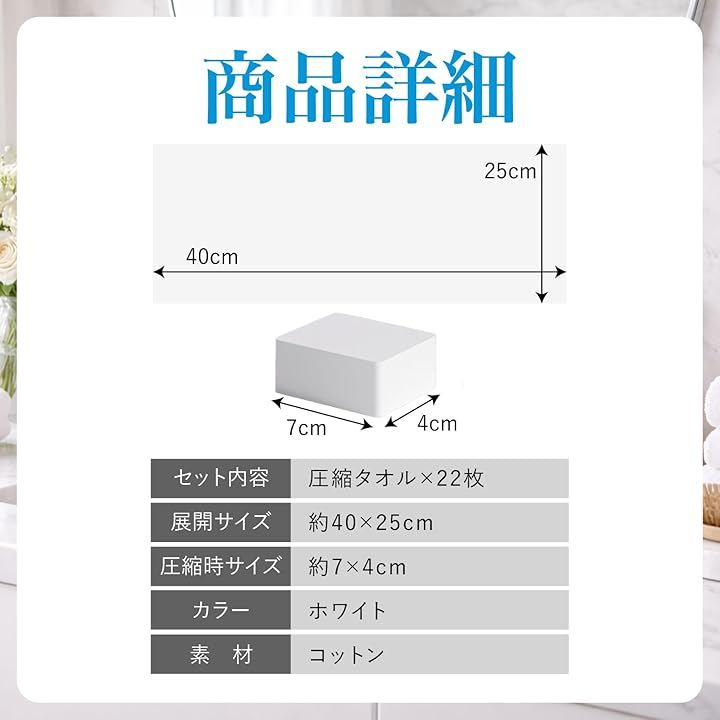 「商品詳細」セット内容:圧縮タオルx22枚 展開サイズ:約40x25cm 圧縮時サイズ:約7x4cm カラー:ホワイト 素材:コットン *モニター環境により色味が異なる場合があります。