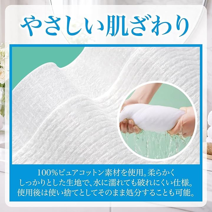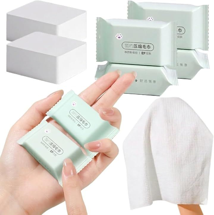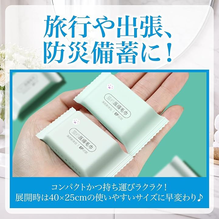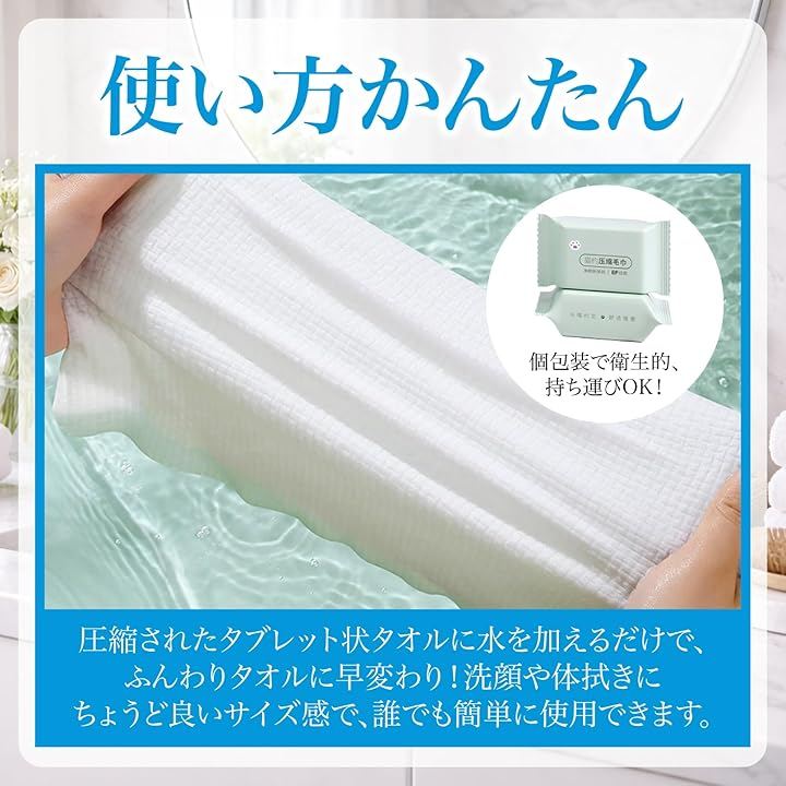 「使い方かんたん」圧縮されたタブレット状タオルに水を加えるだけで、ふんわりタオルに早変わり。洗顔や体拭きにちょうど良いサイズ感で、誰でも簡単に使用できます。