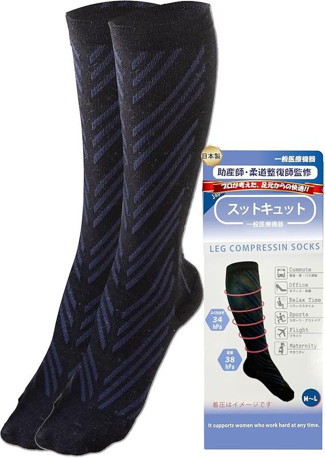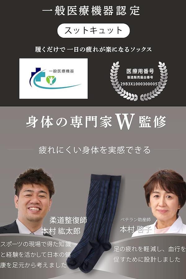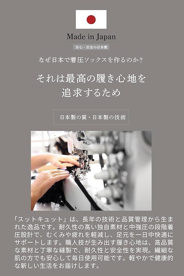 現代人の脚の悩みを解決するために開発された「スットキュット」 長時間の立ち仕事やデスクワークで脚に悩む方に最適な着圧ソックスです。