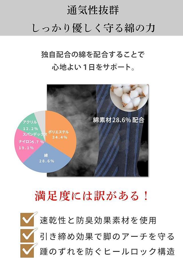 「脚のアーチを守る引き締め効果」 適度な着圧が足のアーチをサポートし、疲れにくい快適な履き心地を実現。