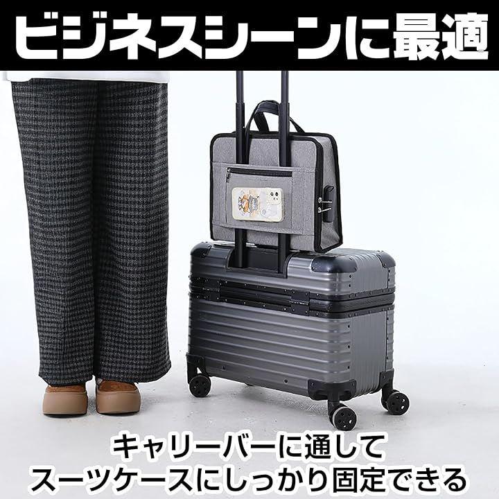 「キャリーケース取付対応で出張も快適」 背面にはスーツケースのハンドルに固定できるバンドを装備。