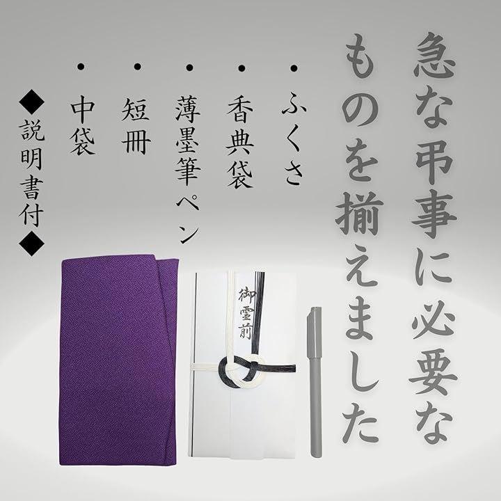 急なお葬式、法事や弔事に香典袋と薄墨筆ペンと袱紗のセットをご用意しました 書き損しても安心な短冊付きです お葬式では薄墨の筆ペンで記入することをお勧めします メーカーの在庫状況により商品の仕様が変わります 「香典袋」商品により水引の本数がかわる場合があります、また水引の色に銀色が入る商品もあります 「薄墨筆ペン」メーカーにより商品のロゴがかわります 「袱紗」メーカーの在庫状況によりデザインがかわりますが慶弔両用、男女兼用で使用できる商品です 袱紗の色は紫です