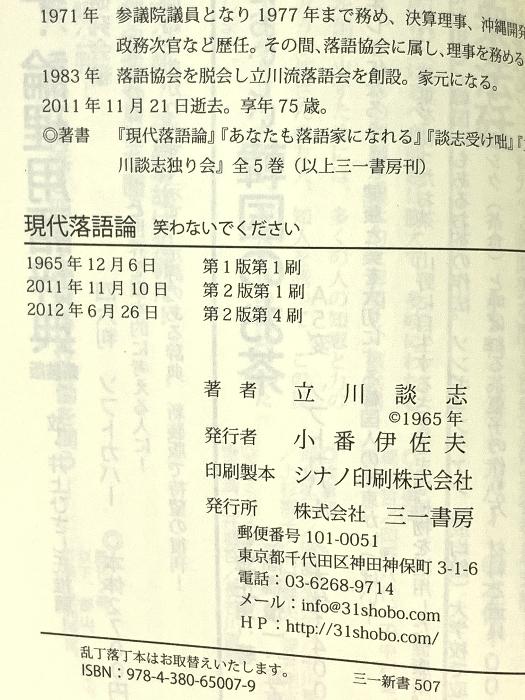 Contemporary Rakugo Theory (Sanichi Shinsho 507) Sanichi Shobo Danshi Tatekawa
