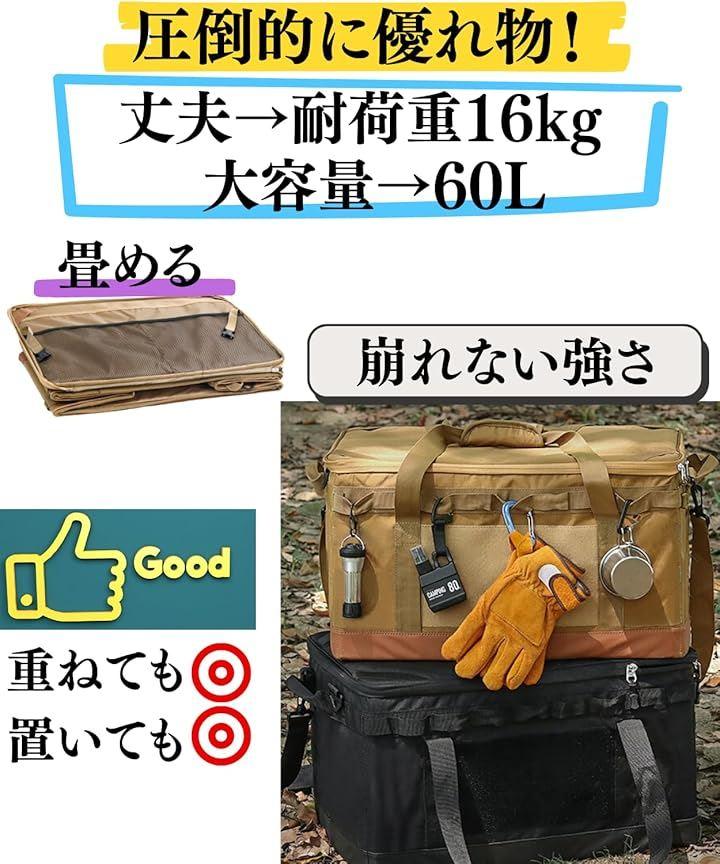 容量は60Lで、キャンプギアやツールを余裕を持って収納できます。