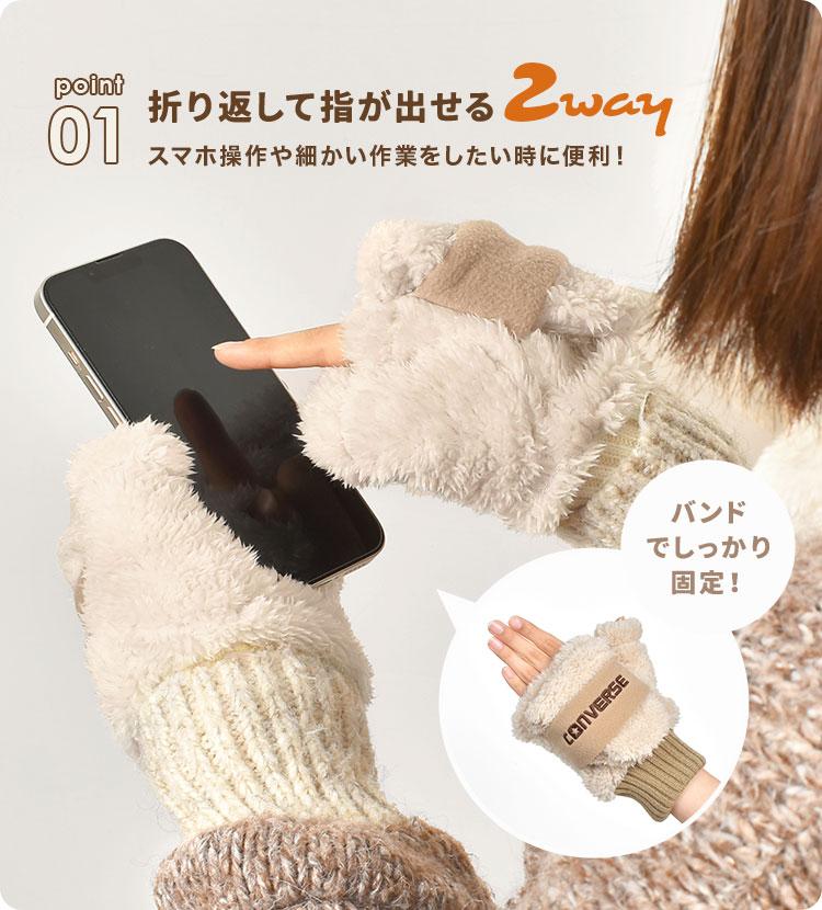 【フリースバンド付きボアミトン】通学通勤やお出掛けなどの防寒グッズとして大活躍すること間違いなし!もこもこのボア素材とリブの組み合わせが可愛いconverseの手袋が登場です♪バンド部分のロゴ刺繍がアクセントとなりカジュアルな雰囲気に。指が出せる2WAYタイプで、スマホ操作も素早くできるので実用性もしっかりあります。ご家族や恋人へのプレゼントにもおすすめです!