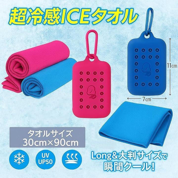 サイズ:タオル/長さ90cm 幅30cm シリコンケース/長さ11cm 幅7cm 高さ4cm セット内容:冷感タオルx2点、シリコンケースx2点 カラー:ブルー / ピンク 2色セット