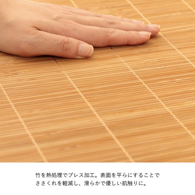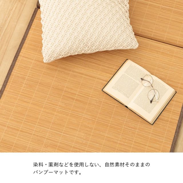 染料・薬剤などを使わない自然素材そのままのバンブーマットです。Qmax0.46の接触冷感で夏でも快適に過ごすことができます。竹の特徴として、汚れにくく耐久性に優れているため、長い間ご愛用いただけます。竹には消臭効果もあるため、においも気になりません。ささくれが出るのを軽減するためにプレス加工を行っています。座布団としてやお昼寝時のマットレスとして大活躍。