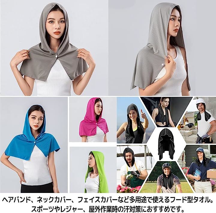 スナップボタン付きフード型タオルで、ヘアバンド、ネックカバー、フェイスカバーなど多用途で使えます。