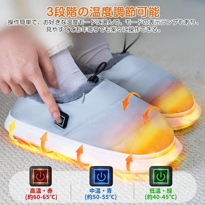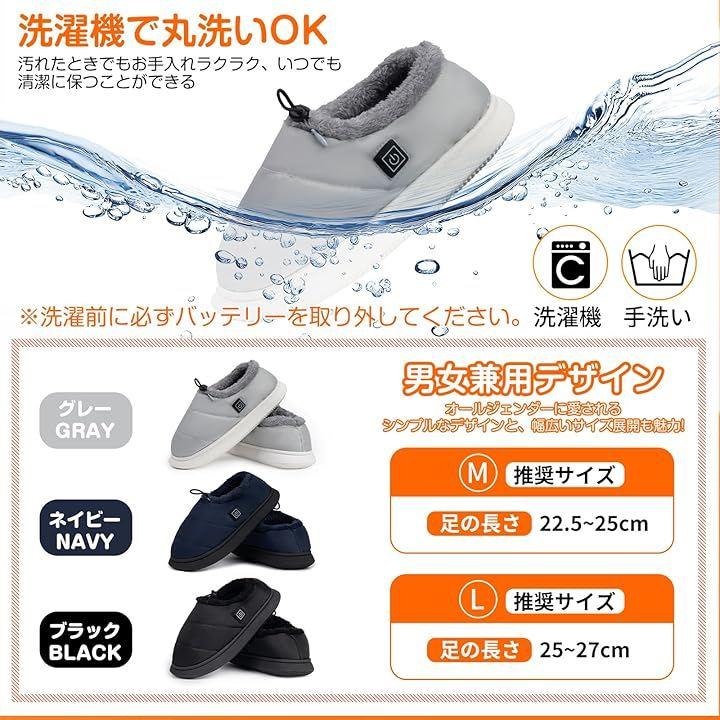 「PSE認証取得・6000mAh大容量バッテリー&2WAY電源対応。」2025新版電気スリッパはDC 5V/2.1A安定出力の6000mAhバッテリーが2個付属しており、高温モードで約3.5時間、中温モードで約5時間、低温モードで約7.5時間の連続使用が可能で、こまめな充電を気にせず、一日中ぽかぽか快適に過ごせます。