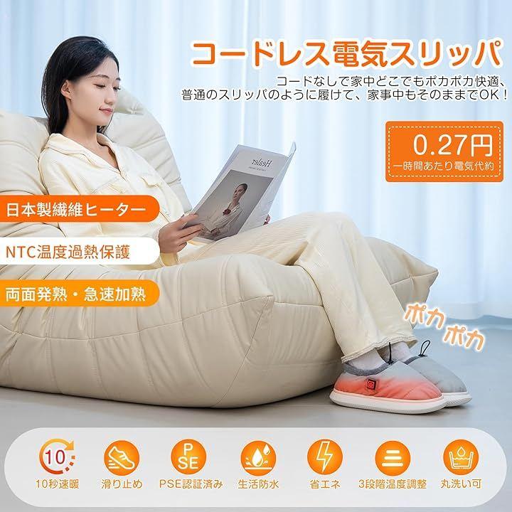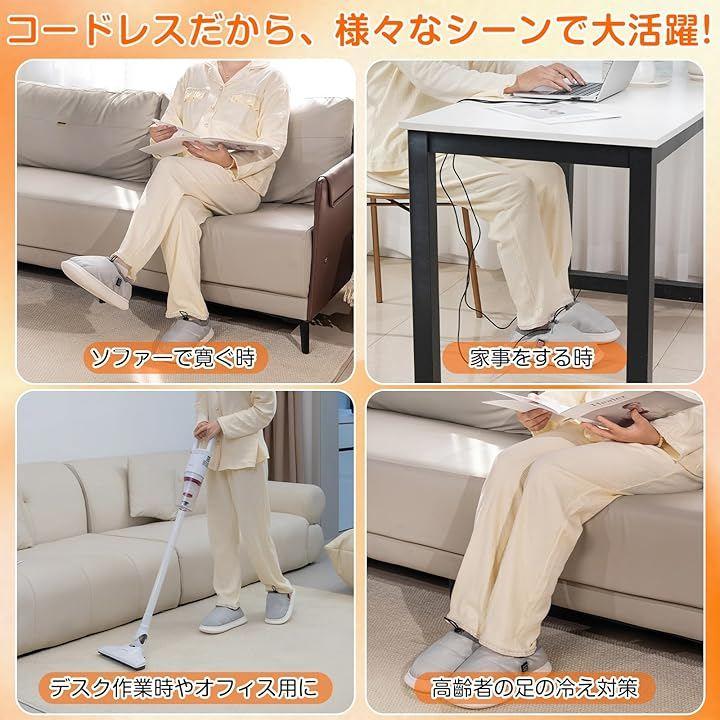 「2025年最新モデル。コードレスで自由に動ける電気スリッパ」フットウォーマーはバッテリーを本体にすっきり収納できる設計で、コードの煩わしさから解放れ、まるで普通のスリッパのように自由に歩き回れます。