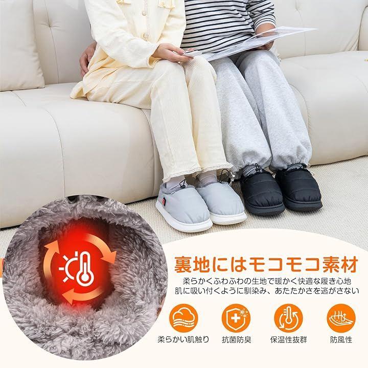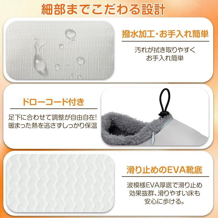「独自開発の透湿防水防寒素材&滑り止め」脱ぎ履きしやすい電熱スリッパはローカット丈の設計を採用しており、表面は独自開発の透湿防水防寒素材が使われて、生活防水仕様だから、家事をする時またキッチンでも濡れる心配がありません。