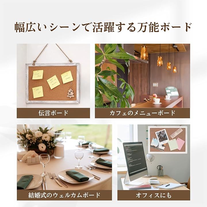 「幅広いシーンで活躍するボード」 ご自宅での家族の伝言板や写真展示、オフィスでのタスク管理、カフェや店舗のメニューボード、さらには結婚式のウェルカムボードなど、プライベートからビジネスまで幅広くご活用いただけます 。