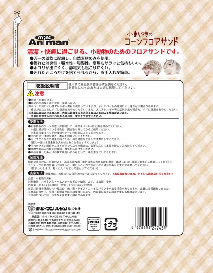 天然素材であるトウモロコシの穂軸のみで作った、小動物専用の床材。消臭性・吸収性・吸湿性にも優れ、夏場もサラッと気持ちよく過ごせる。一般的な木製・紙製の床材と比べるとホコリが出にくく、低アレルギーなので、いろんなペットにおすすめ。保管に便利なチャック付き。【対象動物】ハリネズミ、ハムスターなどの小動物、カメ、爬虫類、小鳥