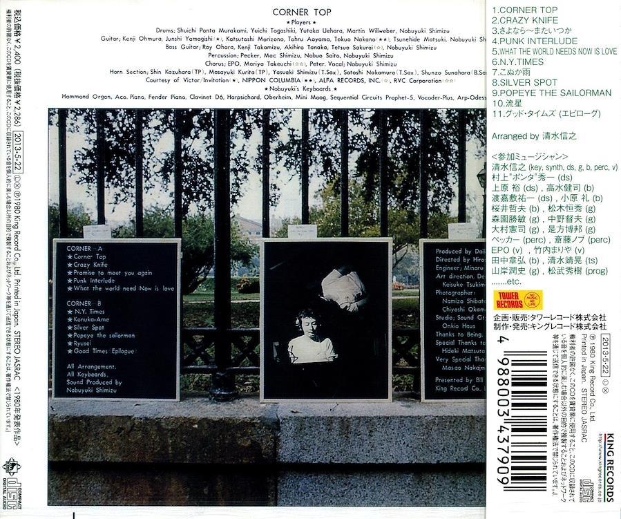 EPOのヒット曲や多くの大物タレントのヒット曲を数多く手掛けてきた天才作編曲家、マルチ・プレーヤーとしても知られる清水信之のソロデビューアルバム。(1980)伊藤銀次作曲・山下達郎作詞の"こぬか雨"(7)のカヴァーではEPO、竹内まりやがバック・ヴォーカルで参加。やや荒っぽい清水信之本人のボーカルが聴ける。疾走するオルガン・フュージョン"CORNER TOP"(1)、さらにEPOがヴォーカルで参加"シルバー・スポット"(8)。