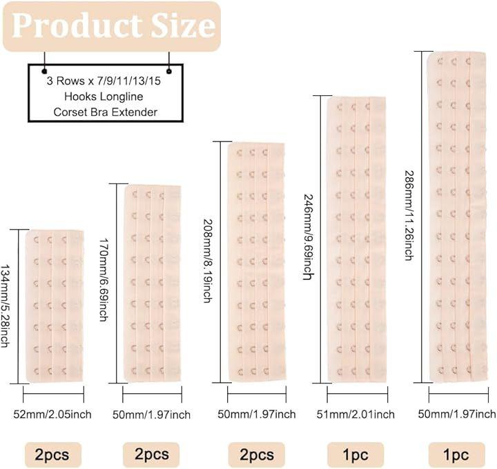 7/9/11段ホック用2枚、13/15段ホック用1枚、おおよそのサイズ:7段ホック: 13.4x5.2x0.35cm、9段ホック: 17x5x0.35cm、11段ホック:20.8x5x0.2cm、13段ホック:24.6x5.1x0.2cm、15段ホック:28.6x5x0.2cm。