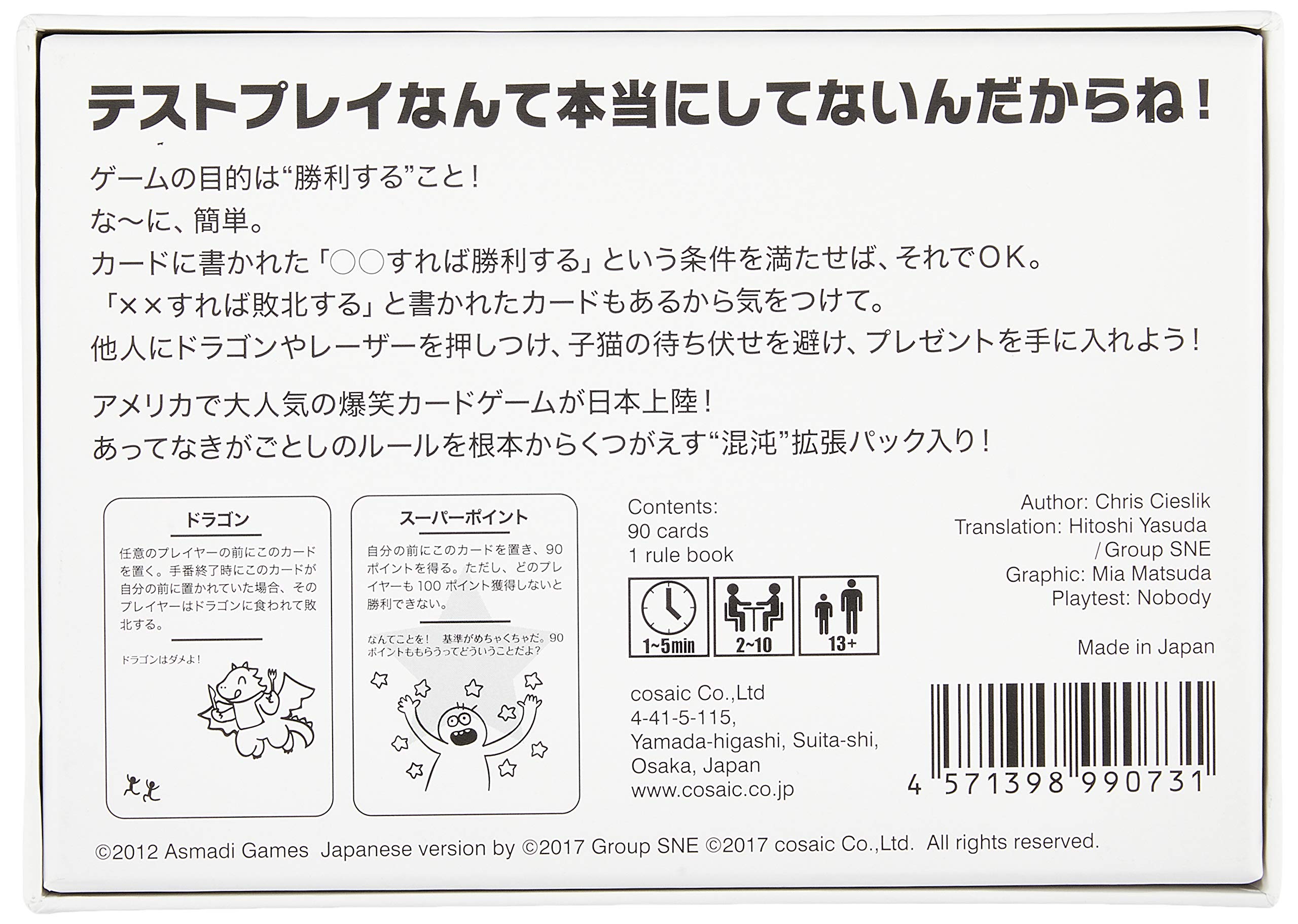 アメリカで大人気の理不尽でおバカなゲームが日本上陸!ゲームの目的はズバリ「勝利する事」。カードに書かれた「○○すれば勝利する」という条件を満たせば、それでOKです。しかし、なかには「××すれば敗北」するといったカードもあるので要注意。他人にドラゴンやレーザーを押し付け、子猫の待ち伏せを避け、プレゼントを手に入れよう!場合によっては10秒でゲームが終了することも!?あってなきがごとしのルールを根底からくつがえす「混沌」拡張パックも同梱。ゲームの合間に、パーティーのお供にぜひお楽しみください。※粗悪な偽造品(海賊版)にご注意ください。偽造品の主な特徴例・新品にも関わらず汚れや傷が多い。・カードの側面(裁断面)がガタガタになっている。・おかしな誤植が多数ある。(正規品には意図的な誤植はありません。)などプレイ人数:2~10人プレイ時間:1~5分対象年齢:13歳以上ゲームデザイン:クリス・シェスリクイラスト:松田実愛(より) 対象年齢:13才以上 プレイ人数:2~10人 プレイ時間:1~5分 ゲームデザイン:クリス・シェスリク ゲームの目的はズバリ「勝利すること」