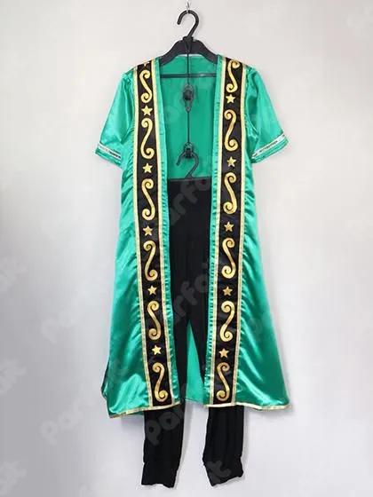 【セット内容】上着、ズボン、腰布、腕飾り【生地の種類】ポリエステル【コメント】自作風の私服衣装です。上着はバスト約86cmで縫製の状態は比較的良好です。上着の模様は手書きで、背中に若干糸引きが見られます。ズボンはゴムウエストで、既製品の柔らかめの生地仕様で作られておりやや使用感があります。腰布はストールを加工しており結び目は作り付けです。安全ピンによる糸引きが見られます。腕飾りは金属製です。