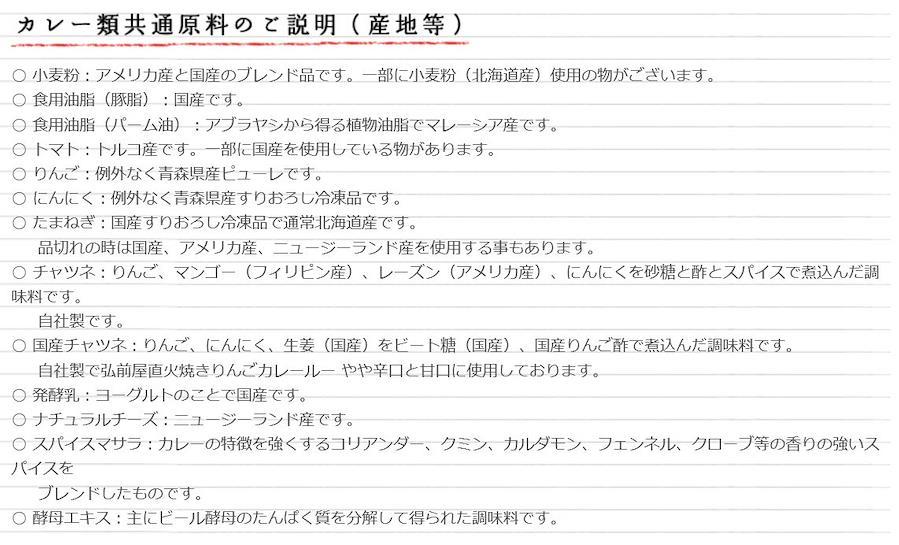 原材料:小麦粉、食用油脂(豚脂)、果実・野菜(トマト、玉ねぎ、りんご、にんにく)、カレー粉、食塩、糖類(上白糖、黒砂糖)、チャツネ、醗酵乳、肉エキス(ポーク、チキン)、酵母エキス、ココナッツミルク、カラメル色素