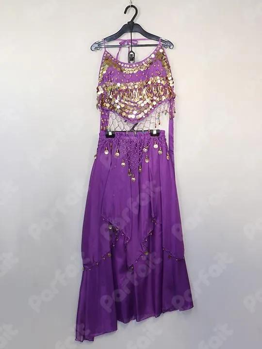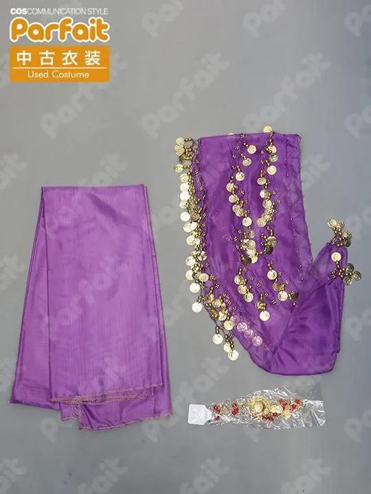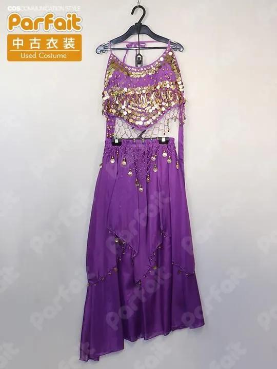 【セット内容】トップス、スカート、腕飾り、頭ベール、ストール【生地の種類】ポリエステル【コメント】比較的状態の良い踊り子風の衣装セットです。スカートはゴムウエストで約60-96cmに可変します。トップスは首と背中の紐で着脱します。スカートに一部糸引きがあります。