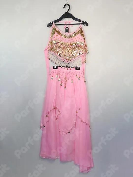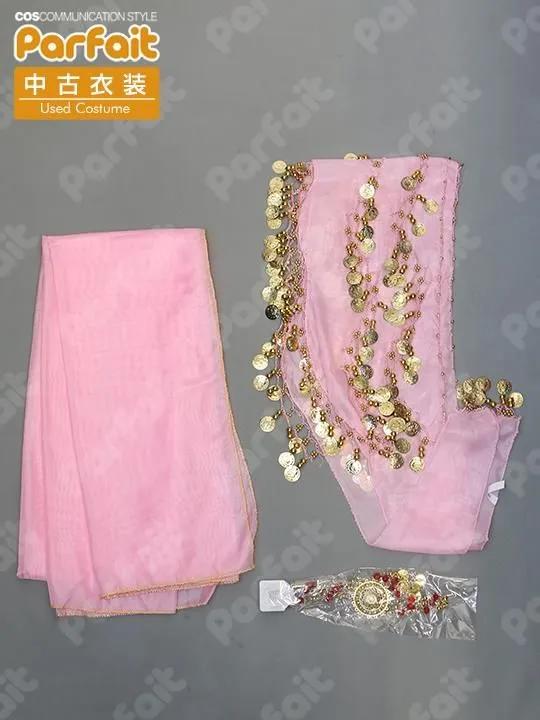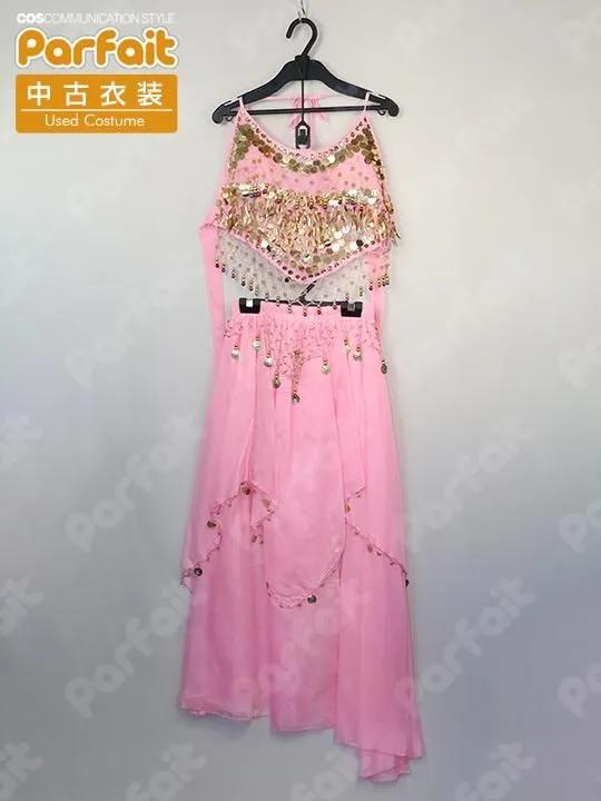 【セット内容】トップス、スカート、腕飾り、頭ベール、ストール【生地の種類】ポリエステル【コメント】比較的状態の良い踊り子風の衣装セットです。スカートはゴムウエストで約58-98cmに可変します。トップスは首と背中の紐で着脱します。