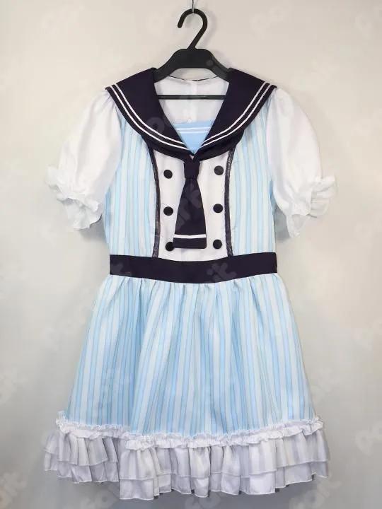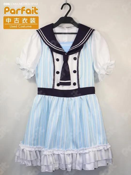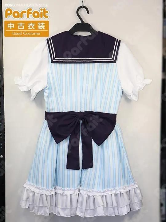 【セット内容】ワンピース、ネクタイ、腰リボン、シュシュ、カチューシャ【生地の種類】ポリエステル【コメント】ワンピースタイプのセーラー服風衣装です。衣装のストライプ柄は昇華プリントで再現されています。胸の紫ラインは合皮縫い付けで、経年劣化による表面ひび割れや剥がれなどが見られます。(2025/11時点、通常の条件、および生地劣化を事由とする返品は不可)カチューシャのリボンや装飾はホットボンドで貼り付けてあります。