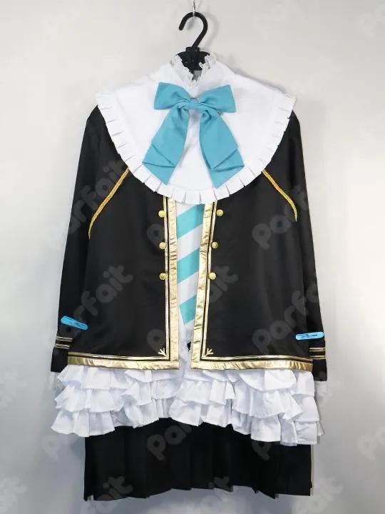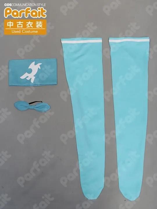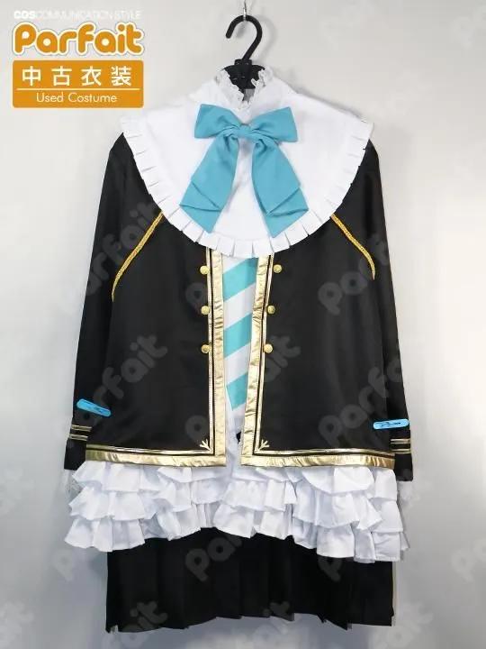 【セット内容】上着、トップス、スカート、襟パーツ、首リボン、上着紐、腕章、靴下、髪リボン【生地の種類】ポリエステル【コメント】使用感がなく比較的状態の良い勝負服衣装です。バスト約103cmウエスト約96cmでウエストが大きめです。襟パーツは首後ろのホックで着脱できます。金ラインは合皮製で状態は比較的良好ですが、上着紐の背面飾りに若干光沢剥がれが見られます。(2025/10時点)トップスのストライプ柄は昇華プリントです。靴下の白ラインは伸縮生地貼り付けで再現されています。