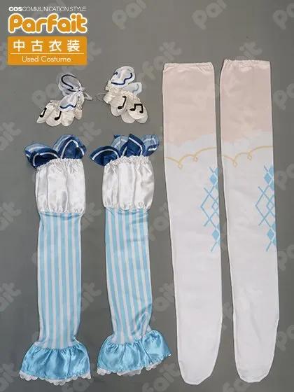 ウィッグが付属した、比較的状態の良い2019年版雪まつり衣装です。バスト約85cmウエスト約72cmです。スカートや腕カバー、靴下の柄は昇華プリントです。腕カバーや髪飾りの布地端に切りっぱなしの状態の箇所があります。ウィッグは前髪が長めで、バンスは毛量が多めです。スカートの白地に一部小さな汚れがあります。