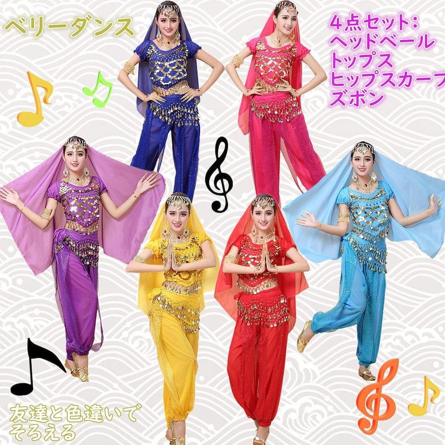 たっぷりとついたゴールドの装飾が華やかな衣装です! 動く度に装飾がシャラシャラと音をたて、エキゾチックな雰囲気を盛り上げます。 着る方の魅力を多いに引き出す鮮やかで素敵なカラーリング♪ ダンスはもちろん、パーティーでのコスプレから野外フェス、普段使いまで幅広くお楽しみいただけます☆セット内容(4点) 1:ヘッドベール 2:トップス 3:ヒップスカーフ 4:ズボンサイズ: フリーサイズ動きやすいパンツタイプなので移動のある野外での使用にも向いています☆弊社 (kuroobaa) のタグが付いております。Kuroobaa商標登録済:登録第6052243号万が一初期不良、品質に問題がある場合は返品、返金対応いたします。