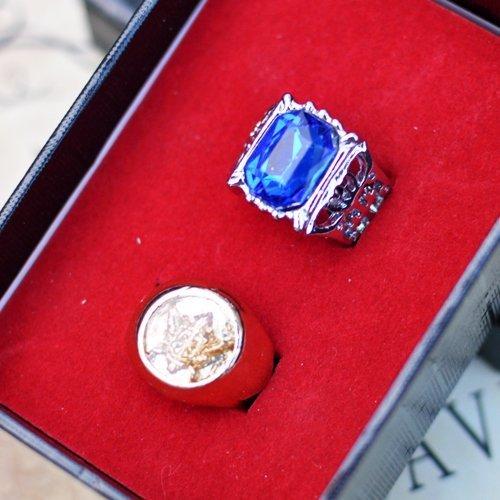 今大人気の ★ 黒執事 ★ 【 シエル・ファントムハイヴ 】 指輪セット<br><br>ブルーサファイア風 サイズ:2、5cmx2cm 内径2cm<br><br>ゴールド風 1、7cmx1、3cm内径1、9cm<br><br>材 質:共に合金メッキ