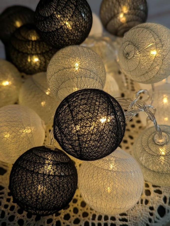 透明なプラスチックボールにコットンの糸を繊細に巻き付けたテクスチャーがナチュラルな陰影をつくり、優しい雰囲気を醸し出します。