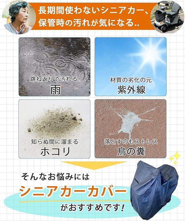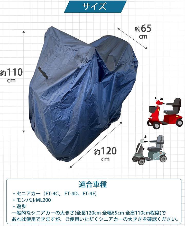 風で飛ばない工夫がされており、雨・日光・ほこりなどによりシニアカー・電動カートが汚れてしまうことを防ぎます。