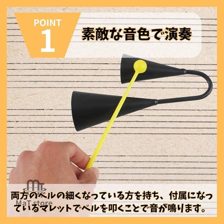 「使い方」両方のベルの細くなっている方を持ち、付属になっているマレットでベルを叩くことで音が鳴ります。