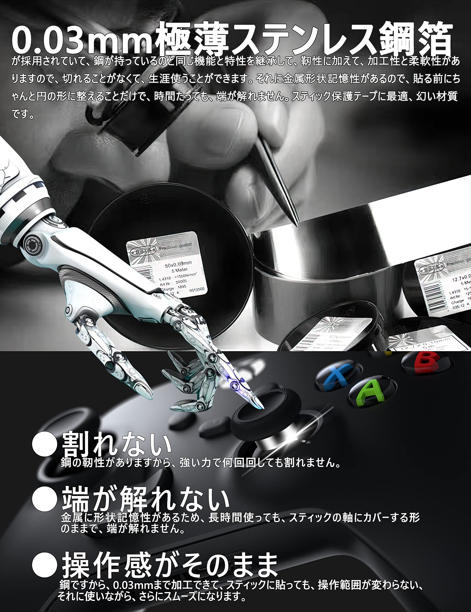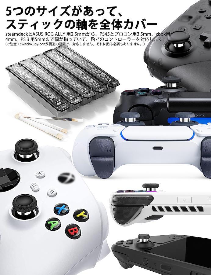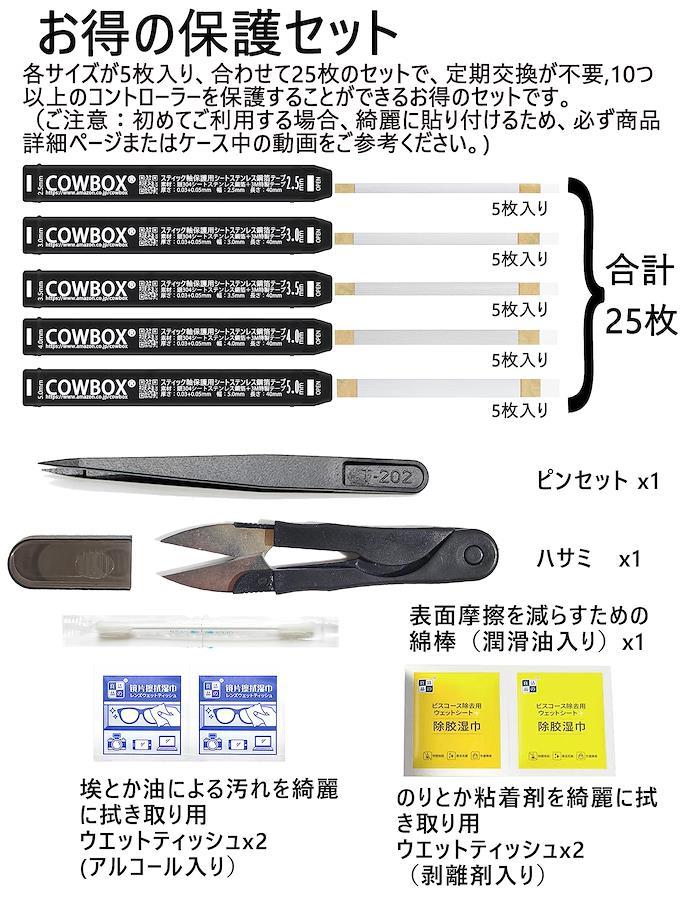 [Value Set] Stainless steel foil tape width 2.5mm x 5, width 3.0mm x 5, width 3.5mm x 5, width 4.0mm x 5, width 5.0mm x 5, tweezers x 1, scissors x 1, cotton swab with lubricant x 2, alcohol infused wipes x 2 x remover wipes (White Powder Protection/Increased Operation) A protective tape that prevents wear and breakdown of the stick part with a single use Stainless Steel Foil Tape: Made with ultra-thin 0.001 inch (0.03 mm) stainless steel foil tape, so it will not break even after many times with strong force. Because it has metal memory, you can simply adjust the shape of a circle before stick it to the stem of the stick, and the edges will not unravel even after long periods of use (3M Special Pressure Sensitive Adhesive) Made with 3m high performance acrylic 200 MP pressure sensitive adhesive that provides strong adhesion while using, so you can use it permanently without having to replace it periodically Compatible with most controllers: Comes in sizes ranging from 0.1 inch (2.5 mm) for Steam Deck and ASUS ROG ALLE, to 0.1 inch (3.5 mm) for PS45 controllers and Switch, 0.2 inch (4 mm) for XBOX controllers, and 0.2 inch (5 mm) for PS3 controllers. All COWBOX controllers have been validated to be compatible. Due to the structure of switch, joy-con, it will not work with or do not need to be applied to [Value Set] Stainless steel foil tape width 2.5mm x 5, width 3.0mm x 5, width 3.5mm x 5, width 4.0mm x 5, width 5.0mm x 5, tweezers x 1, scissors x 1, cotton swab with lubricant x 2, alcohol infused wipes x 2 x remover wipes (Quality assurance from COWBOX) In the unlikely event that there is an unexpected defective or missing number, please feel free to contact us. We will provide you with the reason and order number. Thank you!