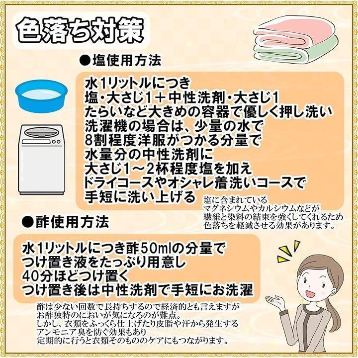 「色落ち対策」*水1リットルにつき、塩・大さじ1+中性洗剤・大さじ1、たらいなど大きめの容器で優しく押し洗い。