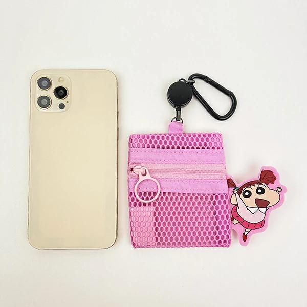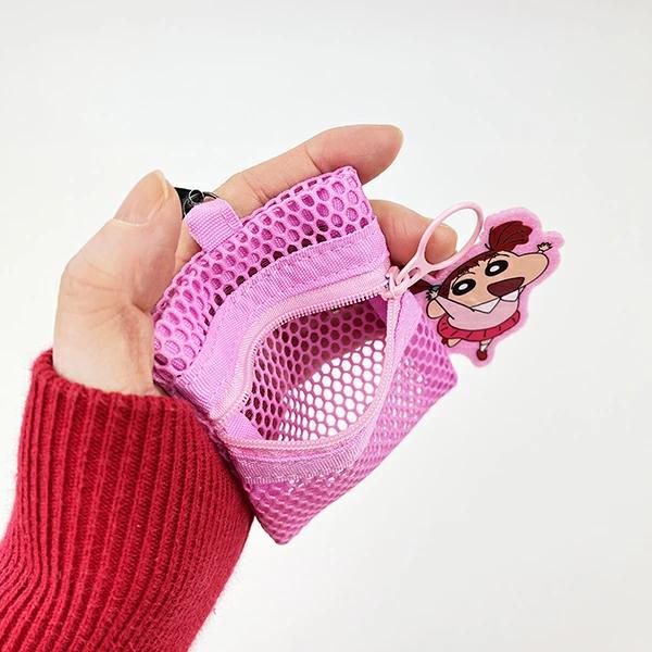 ちょっとした小物を入れてバッグにつけられるクレヨンしんちゃんのメッシュポーチです。 チラッと覗いてる姿が可愛い! リール付きなのでお好きなカバンやリュックに付けてお出かけしませんか♪