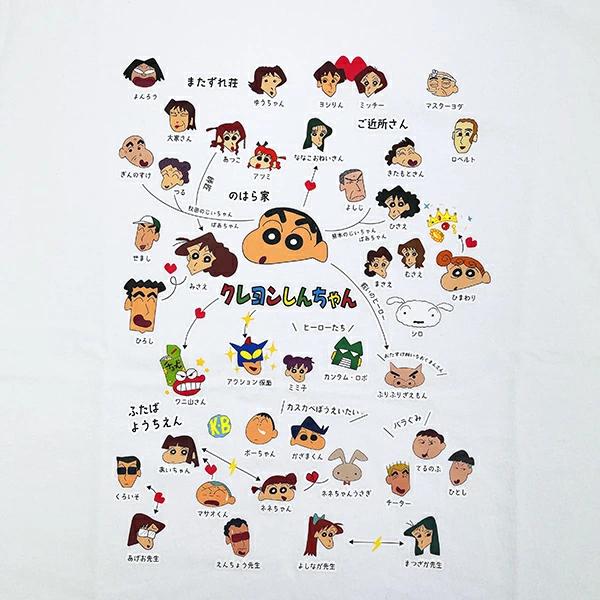 密かに流行っているクレヨンしんちゃんの相関図Tシャツです♪しんちゃんの周りに登場するキャラクターたちの関係性をより詳しくデザインされています♪クレヨンしんちゃん好きにはたまらない☆彡ホワイトとブラックの2色展開なのでお揃いコーデにもぴったりですよ~♪【サイズ】胸囲目安:96~104、身幅:56cm、着丈:72cm、袖丈:24cm