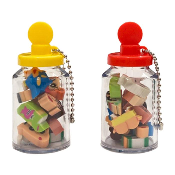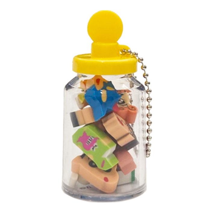 透明なボトルの中に、12種類の小さな消しゴムが入っています。