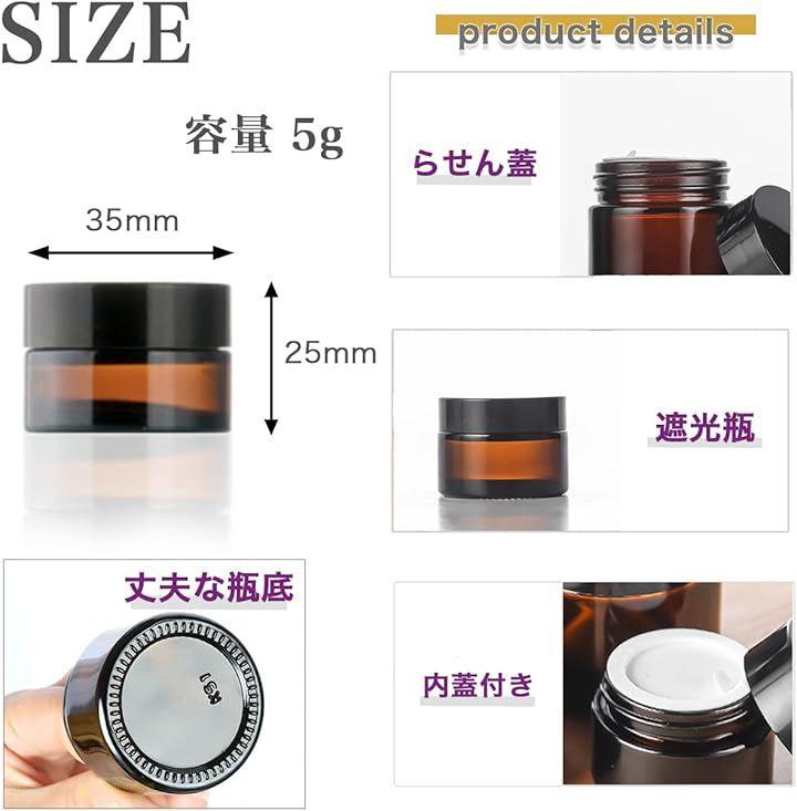 「商品内容」本体:20個入 容量:5g サイズ:直径35mm、高さ25mm カラー:ブラウン 材質:ガラス、ABS 付属:ハンドプル付きガスケット(中蓋) *自社にて検品はしっかり行なっておりますが、どうしても製造上の都合で外蓋に小傷等ができてしまう場合がございます。