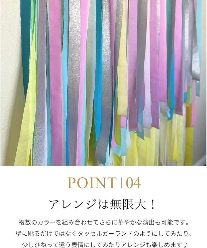 「クレープストリーマー」お家での飾り付けや各種イベント、パーティーなどの装飾で大活躍。壁に順番にクレープ紙を並べて貼っていくと簡単に、とても華やかなデコレーションが完成します。