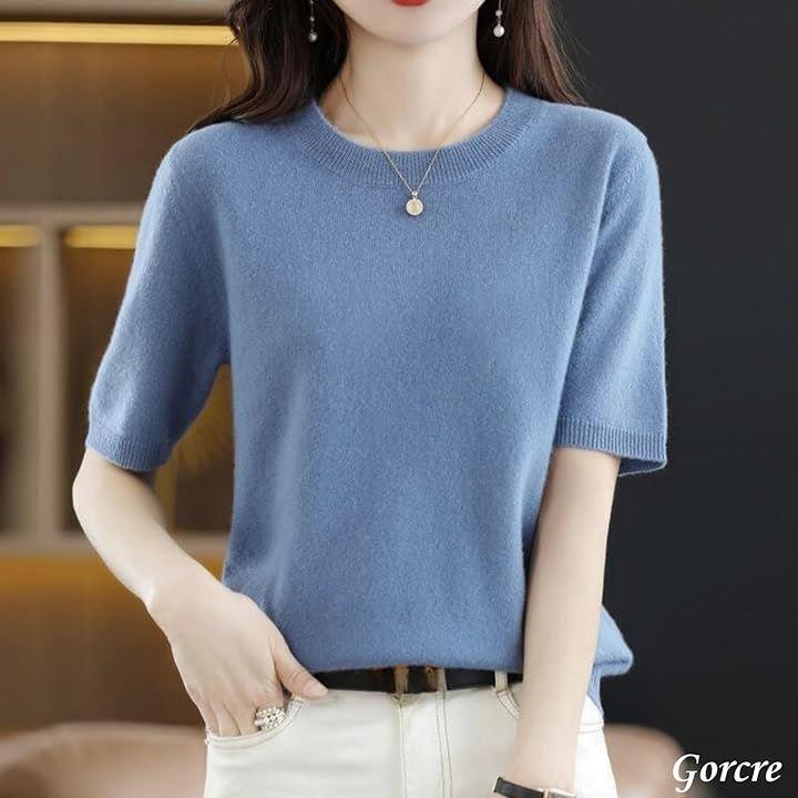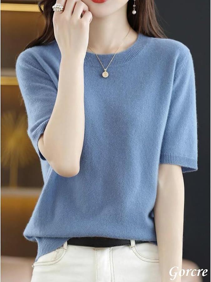 クルーネックの半袖に、襟と袖がリブ仕様になって、フェミニンな大人の女性を演出。